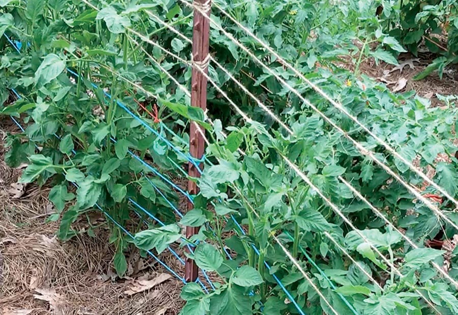 Loose, sagging twine won’t support anything. As you work, keep constant tension on the line. The twine should be firm enough to hold plants upright but not so tight it bends or cuts into stems.