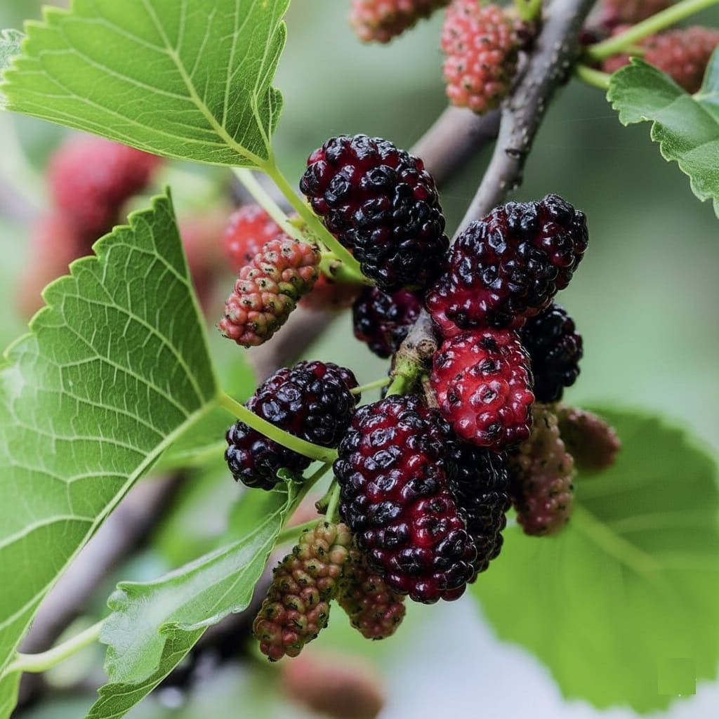 1. Black Mulberry (Morus nigra) hails from Iran and produces what many consider the finest fruit—large, juicy berries with a complex balance of sweetness and tartness, similar to blackberries.